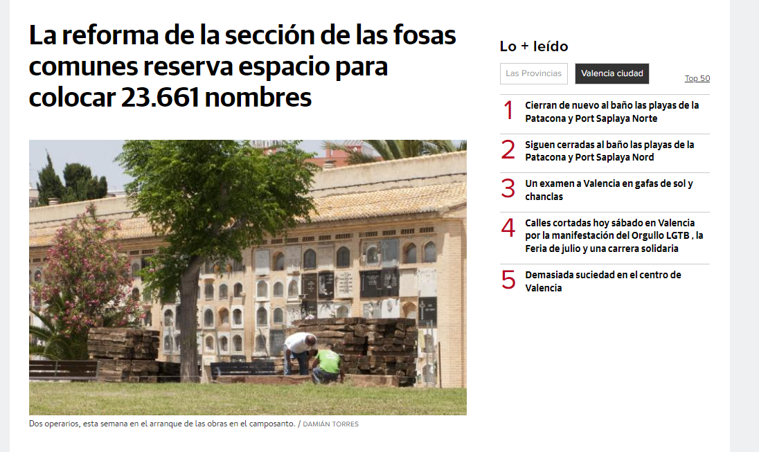 El primero, con el titular de «La reforma de la sección de las fosas comunes reserva espacio para colocar 23.661 nombres«, muestra las obras en ejecución del proyecto de Puesta en valor de las Secciones 7 Derecha y 4 Izquierda del Cementerio General de Valencia. En el segundo, «Un edificio protegido del Cabanyal acogerá un centro cultural«, avanzan las próximas obras del proyecto para Equipamiento Sociocultural en el Cabanyal.